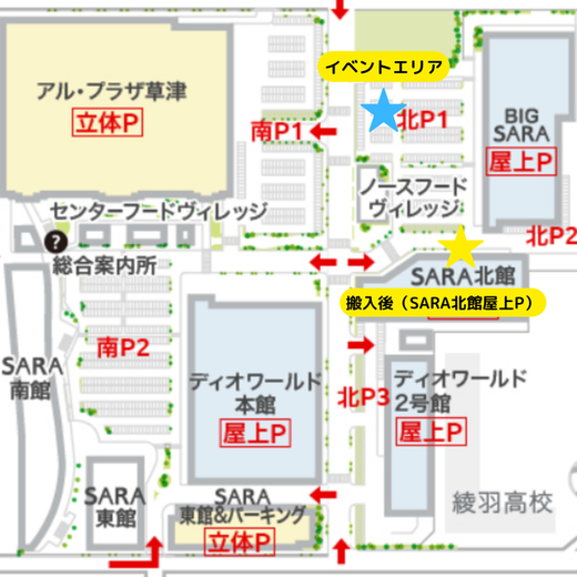 (2)その後、SARA北館屋上駐車場(★)にお車を移動していただきます。